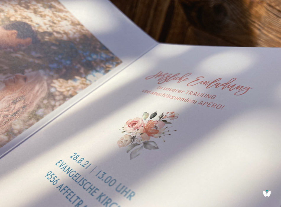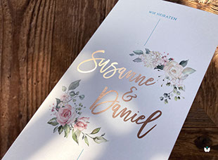Leistungen: Gestaltung der Hochzeitskarte mit Goldschrift und VIP-Einlage